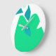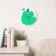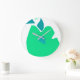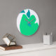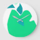 This white background wall clock has an illustration in the shape of a green pear and triangular blue centre.