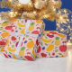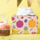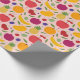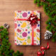 This wrapping paper pattern is a delightful celebration of vibrant fruits, perfect for adding a touch of freshness and fun to any gift. The design features an array of colourful fruit illustrations, including yellow bananas, red apples, green pears, purple grapes, and pinkish-red pomegranates, all set against a light yellow background. Scattered among the fruits are smaller elements like green leaves, blueberries, and flowers in shades of purple and blue, adding to the playful and lively feel of the pattern. Ideal for festive occasions, birthdays, or any celebration that calls for a cheerful and eye-catching presentation.