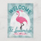 Ft Lauderdale Florida pink flamingo. In vintage travel posters style, it says "Welcome To Ft Lauderdale, Florida" in pink, white and mint green turquoise.
