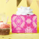 Wrapping paper in a tie dye pattern in shades of deep fuchsia pink, orchid, and pastel pink, accented with soft violet