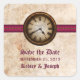 These Antique Clock Save the Date Stickers feature a vintage timepiece prominently centred on top of a metal ball chain and sleek fuchsia pink striped border. The distressed look of the grungy paper texture background completes the antiqued feel of this unique design. These offbeat save the date stickers are perfect for announcing your vintage or steampunk inspired wedding. Easy to customise, simply add your wedding details in the spaces provided. Click on "Customise It" to find additional options to personalise this design.