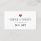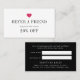 Encourage customers to refer friends with these chic referral cards in black and white with a pop of fuchsia pink. Perfect for salons, nail techs, makeup artists and boutiques, our modern and simple design features a hot pink heart with "refer a friend" and your referral deal shown on the front (shown with "you'll both receive 20% off"). Personalise the reverse side with your referral terms, business name, location and contact information. Includes space for the names of the referrer and the new customer.
