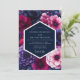 This dramatic floral design features a moody and romantic aesthetic perfect for an elegant evening affair. A lush arrangement of vibrant fuchsia, deep purple, and rich magenta roses and anemones blossoms against a dark navy background. The painterly quality of the botanicals creates a sophisticated and opulent atmosphere for your special day.