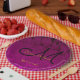 Wedding dinner reception decor. Fuchsia hot pink gold black floral monogram custom paper plates. Chic, elegant, modern, trendy, classy, stylish, beautiful succulent metallic pattern. To change the script, click on edit design. Image copyright Marg Seregelyi Photography.