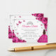 Fuchsia pink silver and white Quinceanera reception details enclosure cards. Features brunette girl in ball gown dress, script font, silver butterflies, hot pink roses and tiara. Perfect for an elegant princess style glam celebration. Personalize with your own details.