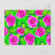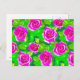 Postcard in a pattern of deep fuchsia pink, watercolor, roses with leaves in shades of emerald green