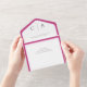 AVAILABLE WITH OR WITHOUT A QR CODE TO SCA IN THE RSVP AREA. This simple yet elegant design has a modern look, with a two-toned fuchsia pink and white background. Add a QR code to your invitation so that gusts can quickly access your wedding Website for details, directions, menu options, and more, or add your gift registry Web URL. Personalised All-In-One invitations are a unique combination of both a beautifully printed custom invitation with an easy to tear off perforated RSVP postcard. And they are so easy to use! You simply fold, then seal the back flap with the three included clear stickers, and mail. And when your guests receive your custom invite, they just tear the perforated RSVP Card off and drop it back in the mail to you! Created by Simply Farmhouse Press.