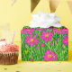 Wrapping paper in a pattern of deep fuchsia pink wildflowers, with yellow centres, in a field of green grass