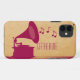 Quirky and unique Vintage Gramophone Case-Mate iPhone 4 Barely There ID Case in dark pink featuring a silhouette of an old-fashioned gramophone and a cascade of musical notes on a digital art rendered paper background. This chic iPhone case will protect your phone with a dash of vintage flair and is perfect for any music lover. Easy to customise, simply personalise with the text of your choosing. Click on the "Customise It" button to find additional personalisation options.