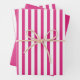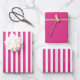 Coordinating gift wrap for all occasions. This is a simple stripes pattern in a fuchsia and white all-over print. There are two sheets with stripes and one solid fuchsia coordinating sheet.