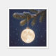 A radiant full moon Christmas ornament is gracefully suspended from a snow-dusted pine branch, surrounded by a twinkling tapestry of stars in the night sky