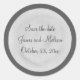 This painting of a bright full moon is shown in a dark night sky, with placeholders for the wedding couple's names and wedding date, written across the moon in dark grey text. They are printed on Save the date Stickers. Personalise and purchase at CherylsArt on Zazzle.