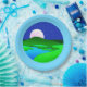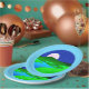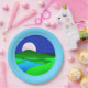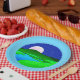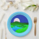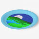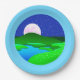 Paper plates in a circular illustration of a full moon rising over green hills by a lake shore, with a starry midnight blue sky