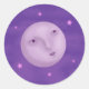 A lavender moon surrounded by twinkly star on a dreamy purple background.