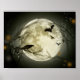 Halloween and gothic themed image. A big full moon at night with bats flying around and a raven sitting on the branch of a craggy tree.