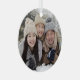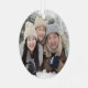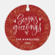 This festive double-sided ornament features a full photo and fun lettering. The front features a full family photo. On the back, white lettering reads "Season's Greetings" with your name and holiday year below. The typography design is framed by a gold wreath against a red background.