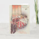 This vintage Victorian era greeting card has a very simple design. It depicts two children waking up to stocking filled with toys on Christmas morning.