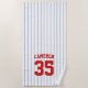 Baseball jersey stripes style beach towel with colours that are fully customisable. Click customise and change the background colour. To change the stripes colour, click customise, select ThinStripes1 layer and change the fill colour. Personalise it by replacing the placeholder text. For more options such as to change the font and it's size/colour, the spacing between letters or to expand or contract curved text click the "Customise" button. *Please note that the Zazzle Watermark that appears in the zoom preview will NOT appear on the final printed product. © Rosewood and Citrus