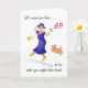 A lighthearted, encouraging 65th Birthday Card with a woman dancing and singing with a little dog, from a pen and wash illustration by Judy Adamson. The front cover text is a well-known George Eliot quotation.