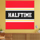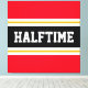 This sporty, athletic design features bold HALFTIME text inside a highlighted wide black stripe with double white racing stripes against bright red outer stripes. The text in this design can be personalised.