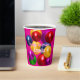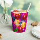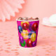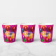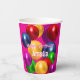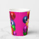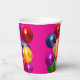 Fun and colourful birthday party paper cups featuring a rainbow of floating balloons set against a bright pink backdrop. Super easy to customise for a fun filled event.
