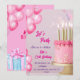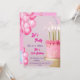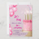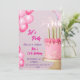 An elegant birthday party invitation design featuring a pink and gold theme. The centerpiece is a beautifully decorated pink cake with golden candles and star-shaped sprinkles. Pink watercolor balloons add a festive touch, while the text highlights the celebratory tone with stylish fonts. Perfect for a 13th birthday celebration.