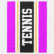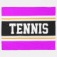 This sporty, athletic design features bold TENNIS text inside a highlighted wide black stripe with double white and yellow orange racing stripes against bright pink outer stripes. The text can be personalised.
