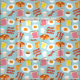 Breakfast staples like ham, orange juice, a sunny-side-up egg, toast, coffee, and bacon make up this delicious illustrated pattern.