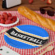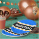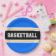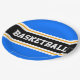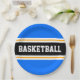 This sporty design features bold BASKETBALL text inside a wide black horizontal centre racing stripe highlighted with twin floating white pinstripes against bright blue outer stripes. The text can be personalised.