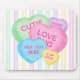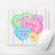 Customisable conversation heart design featuring lime, cherry, banana, grape candy hearts with cute sayings. Raspberry heart has text placeholders for your own personal message. Candy striped background. PinkInkArt original!