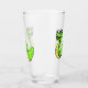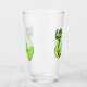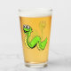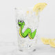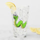 This glass tumbler for beverages has a fun cartoon snake who is bright green with a yellow stomach and has a big smile on his face on the front and back.