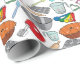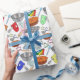 Here's wrapping paper perfect for bakers. It features a fun pattern of illustrations of baking tools and equipment, including cookie cutters, cake pans, mixing bowls, hand mixers, measuring spoons and cups, spatulas, rolling pins, and muffin tins.