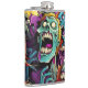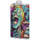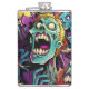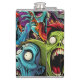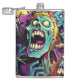 Multiple cartoon-like zombie faces, each with exaggerated expressions, cover the flask’s surface. These zombies exhibit various skin tones—green, purple, and blue—and sport wide eyes and open mouths, revealing sharp teeth. Some appear to be screaming, while others convey shock or horror. The intricate design creates a sense of chaos and intensity, making it appealing for fans of horror-themed artwork.