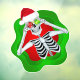 This window cling has a fun Christmas skeleton wearing a Santa Claus hat holding two ornaments up to his eyeballs peeking out from a vibrant green and red splatter shape.