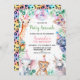 This colorful safari themed birthday invitation can be used for any age and features several jungle animals, party hats, disco ball, foliage and colorful dots.