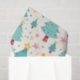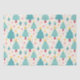 Fun colours decorate jolly little Christmas trees that parade over this light-hearted holiday tissue paper. A light teal blue green colours the festive trees amid fields of pink and yellow stars on an off-white background. This cute design is from a retro watercolor pattern.