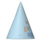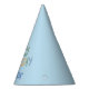 This fun kids birthday party hat features a colourful 'Happy Birthday' text against a light blue background. Customise with her/his own name.