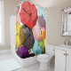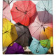 Fun, colourful, floating umbrellas in multi colours of red, pink, black, purple, yellow, light blue, and aquamarine.  Sun shines through them as you look up.  A delightful summer photograph for your bath decor.
