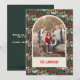 Fun modern photo holiday cards with a background pattern of colourful festive words "love, light, peace, joy, hope" in red, green pink and off white. Overlaid is your photo in an arch shape. Sign off in red font and a back message.