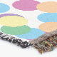 Colourful polka-dots design in magenta, orange, yellow, green, blue and purple.