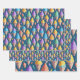 These colourful birthday party wrapping paper sheets feature a playful summer design with cute ice cream cones in pink, purple, red, yellow, green, and orange – all in the colours of the rainbow! The vibrant colours pop against a navy blue background, creating a fun and festive look. The set includes three sheets, each featuring the same design in three different sizes of the ice cream pattern. Perfect for kids' summer birthday celebrations, it's also great for anniversary parties or any special occasion that calls for a bright and playful design.