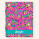 Customisable name notebook in retro 1980s and 1990s theme, with bright and colourful vintage items such as cassette player, Rubik's cube, sweets, scrunchies, etc. in hot pink, turquoise, and yellow colours.