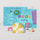 Destei's colourful illustration of a blue summer swimming pool scene. In the pool there is a purple swimming mattress, a green swimming ring and a pink swimming ring. On the bottom of the design there is a white tile floor and on it there are some items. The items are an orange drink with a straw, black sunglasses, yellow and white striped sun shade umbrella and a plate of fruits. The fruits include a watermelon slice, an orange slice and three strawberries. The front reads: "Pool Party" in colourful lettering over the pool water. On the other side there are personalizable text areas for the details of the party. This design is ideal for summer pool parties, swimming pool birthday parties or for general get together parties in the summer time.