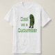 Funny green cucumber standing with his arms folded and a cheeky grin on his face. He is wearing a black vest waistcoat, brown boots and black shades. To the side and below him are the words "Cool As A Cucumber" in green lettering.