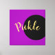 This fun template design features centred, festive, warm yellow script "Pickle" text against in front of a black centre circle and vibrant grape purple background. The text can be personalised.