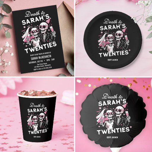 Say goodbye to your 20s in style! This bold black and pink skeleton invite sets the tone for a spooky-fun “Death to Your Twenties” birthday bash, customised for you.