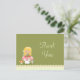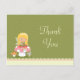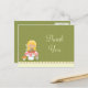 This adorable girls birthday party thank you post card has a fairy theme. There is a fairy with blonde hair sitting on a mushroom with a little mouse underneath. The background is an olive green colour with polkadots. The bottom has a cream coloured scallop edge with a pink stripe. Copyright © Zenware Designs