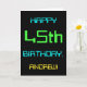 This simple and fun birthday greeting card design features a message like "HAPPY 45th BIRTHDAY, ANDREW!". It also features a fun look inspired by digital computing. The name on the front and the message on the inside can be personalised. It could be sent or given to somebody who is celebrating their forty fifth birthday, and who perhaps works as a computer system administrator, a computer programmer, a network administrator, an electrical engineer, a software developer, or who otherwise enjoys using computers. [~Z0000100]