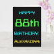 This simple and fun birthday greeting card design features a message like "HAPPY 88th BIRTHDAY, ALEXANDRA!". It also features a fun appearance inspired by digital computing. The name on the front and the message on the inside can be customised. It could be sent or given to somebody who is celebrating their eighty eighth birthday, and who perhaps works (or worked prior to retirement) as a computer programmer, a software developer, a database administrator, a network administrator, an electronics engineer, or who otherwise enjoys using computers. [~Z0000100]