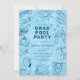 Make a splash with this fun pool party graduation invitation! Featuring a vibrant blue background and playful hand-drawn doodles, this design includes all the perfect summer and graduation elements—an inflatable flamingo, grad cap, swimwear, ice lolly, books, flip flops, swim bag, and sunshine.